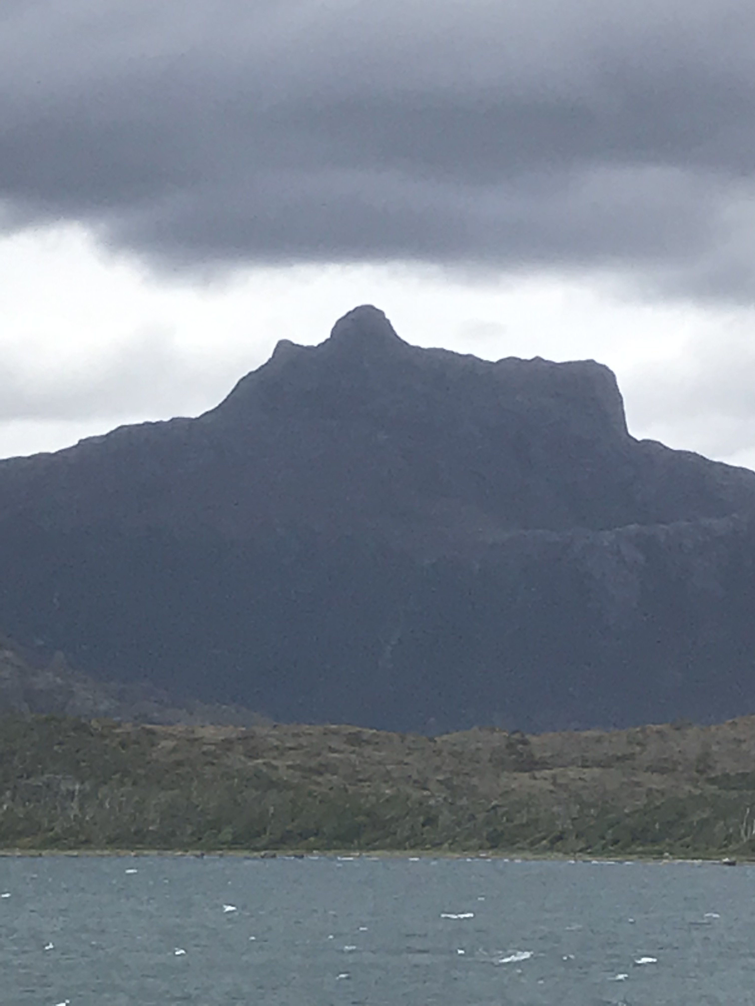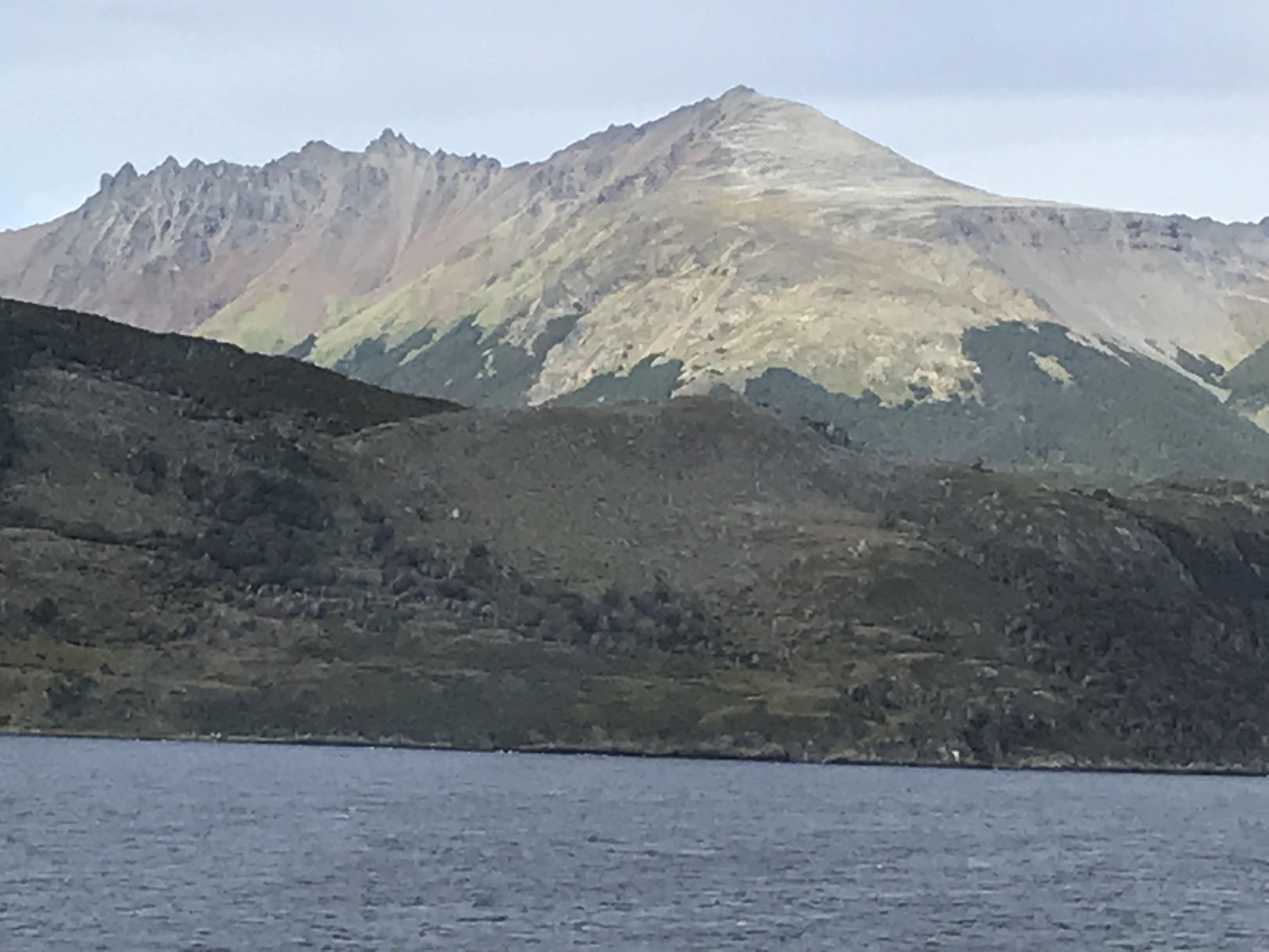 Sailing away this evening it was still beautiful and in the high 60s and we were able to eat and then readon the deck until about 9 pm. We also saw several small dolphins leaping fully out of the water. Our resident whale watcher saw sei whales (a baleen whale—‘the third-largest rorqual after the blue whale and the fin whale’) but we only saw their spouting a few times. We are sailing south and east along the Magellan Strait and were excited to learn we will spend tomorrow sailing the Chilean fjords as well. –Cynthia