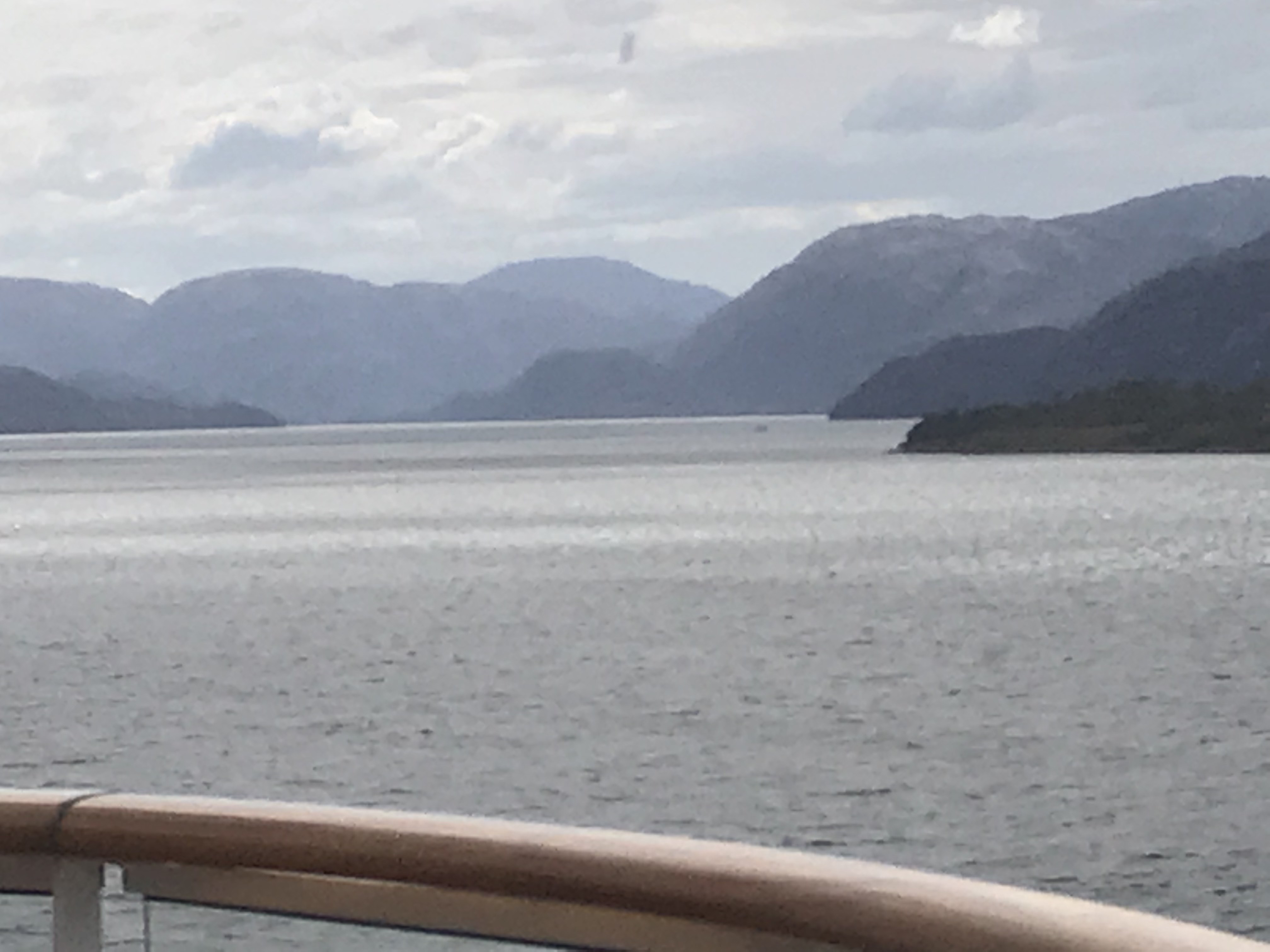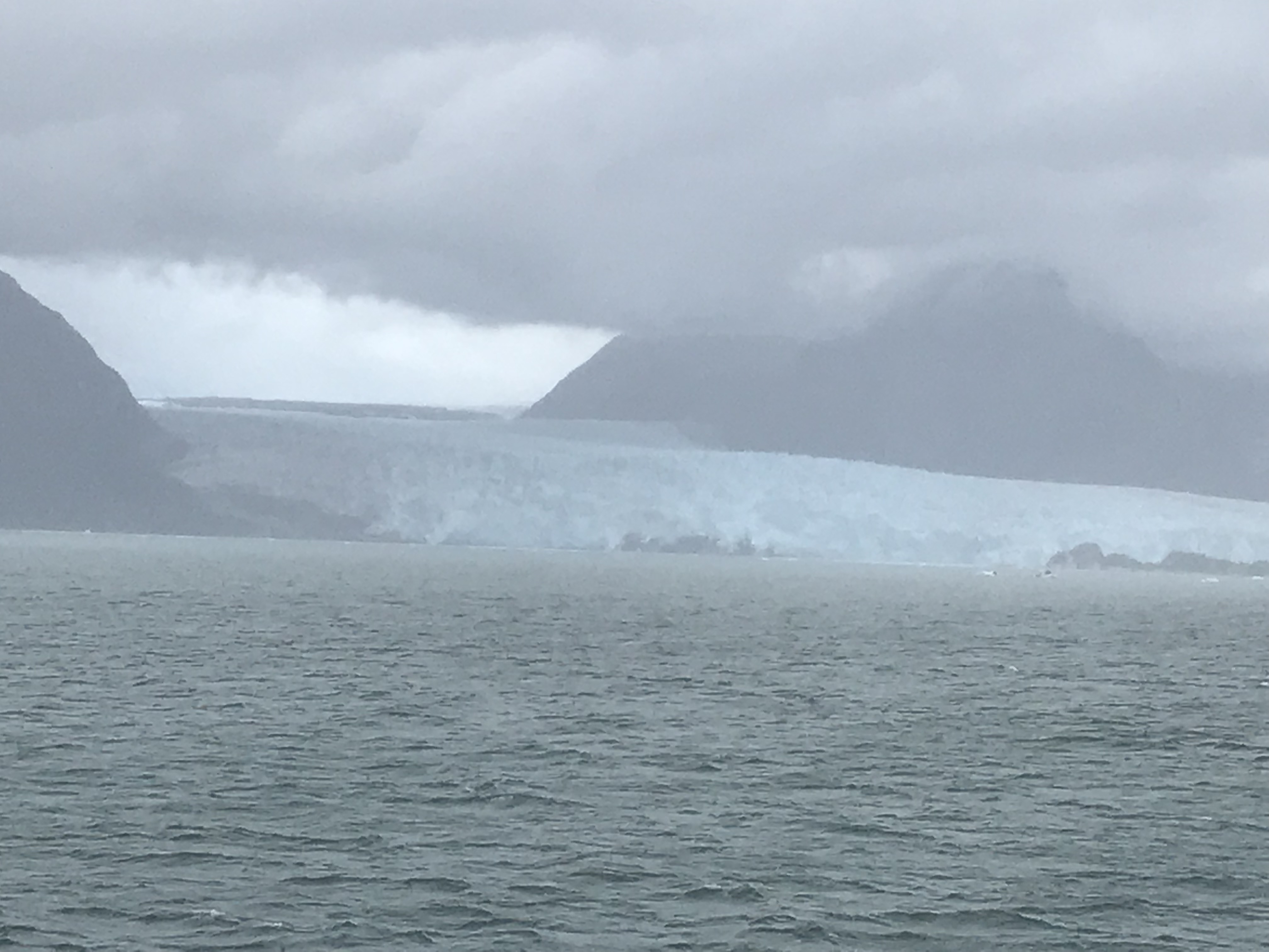 I am attaching a whole bunch of photos of mountain and glaciers as seen from the ship… I could spend an entire cruise sailing these fjords! They are gorgeous. It is a joke many places to say ‘If you don’t like the weather, wait an hour,’ but here it is literally true. We have gone from brilliant sunlight to socked-in fog and back a dizzying number of times in a day. We suspended bridge this afternoon because we were approaching a ‘gynormous’ glacier and rushed outside to take pictures. Unfortunately, we transitioned quickly while passing the glacier from mostly cloudy to socked-in fog so photos don’t do it justice, but I will post some anyway. Actually none of my pictures do the scenery justice, but I still take them. We spent our days sitting and the window reading and looking at the scenery along with some bridge (by a window) and eating (outside or by a window).